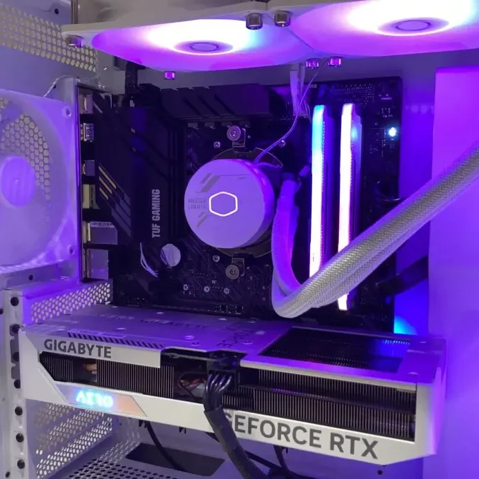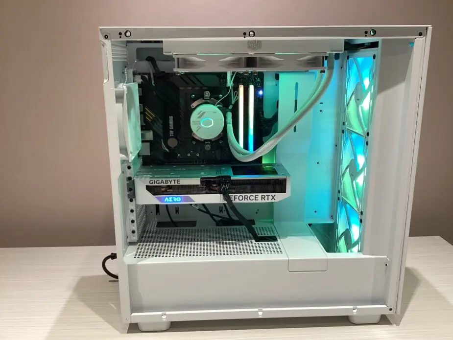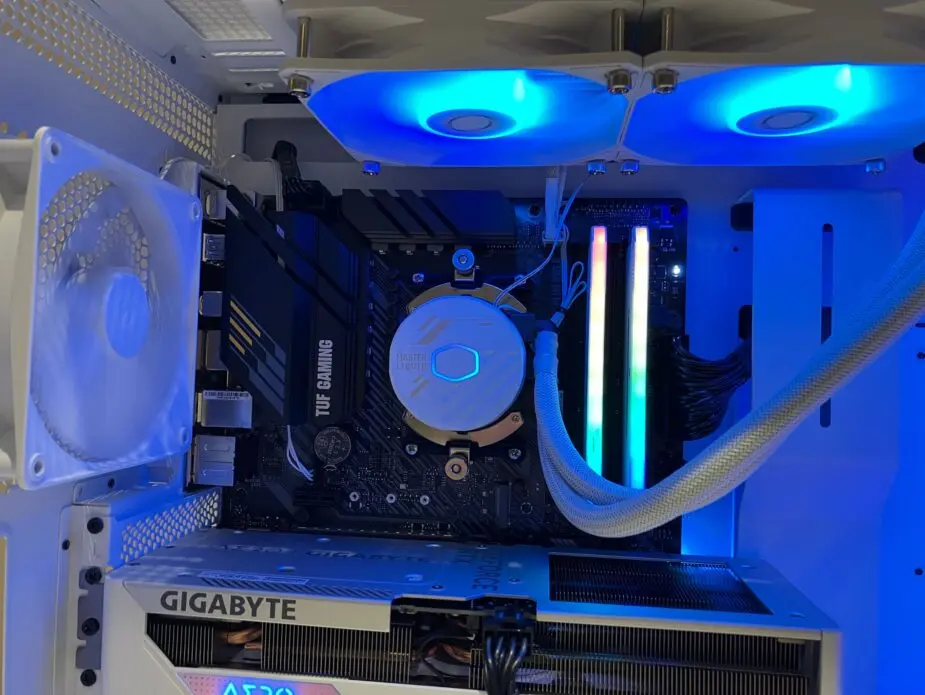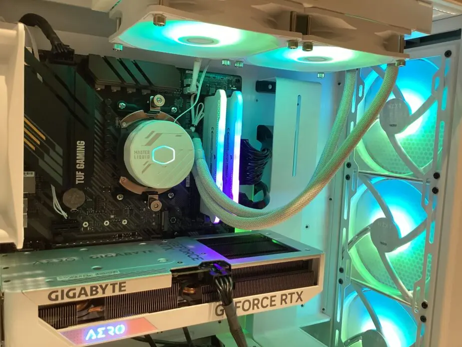 Az építést nagyban nehezítette a fehér alkatrészek beszerzése, a LED világítások egyedi bekötése. A számítógép teljes belső LED világítását az Asus Aura-Sync rendszere vezérli, bele értve a gépház, az alaplap, a memória és a hűtőventillátorok fényeit. Az AMD 5700X processzor stabil működését a belső overclock mellett a CoolerMaster vízhűtése biztosítja, természetesen fehár színveb és szintén Aura-Sync kompatibilis fényekkel.
